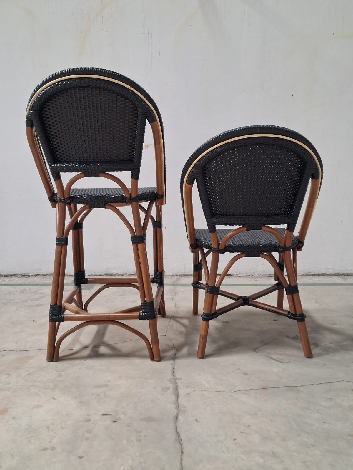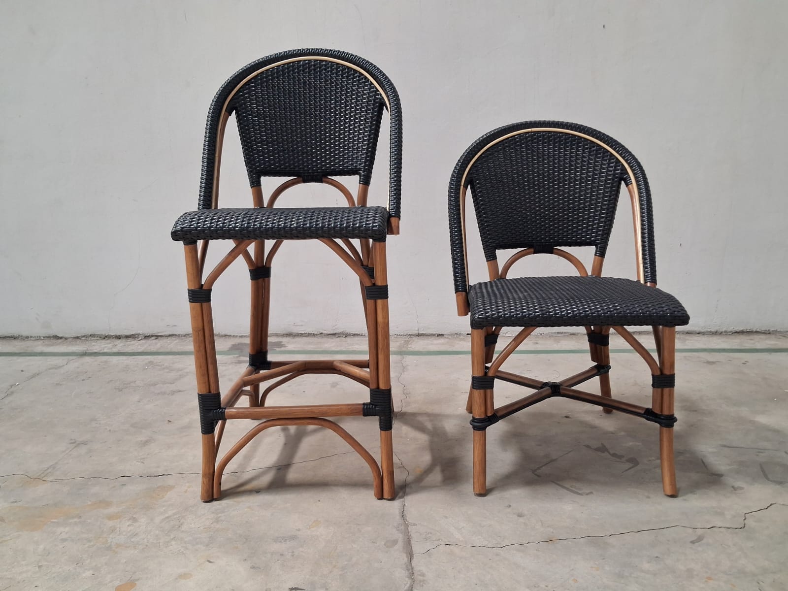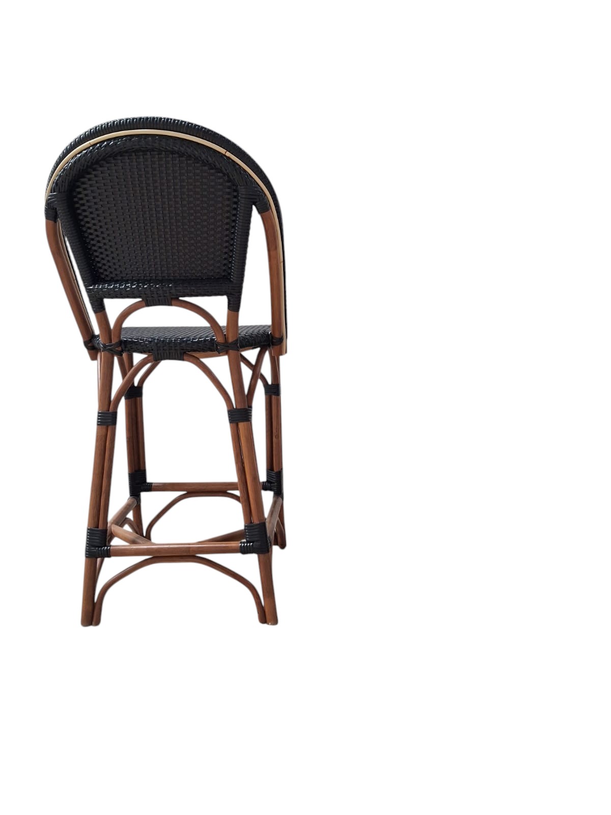 Classic Commercial Grade Bistro Chair Stool Indoor/Outdoor French Bistro Counter Stool, Fade Resistant Black PE Rattan Back and Seat Natural Rattan Pole framing material Holds up to 300 LBS. Static Weight Capacity Per Chair Fixed Floor Glides Protect Indoor Flooring Surfaces No Assembly Required Wipes Clean with a Damp Cloth