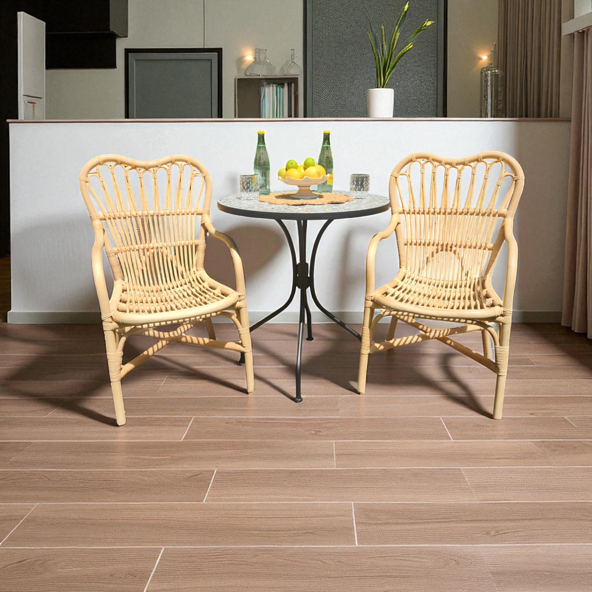 - Rattan frame is hand-bent and hand-shaped, creating subtle organic marks on the rattan.