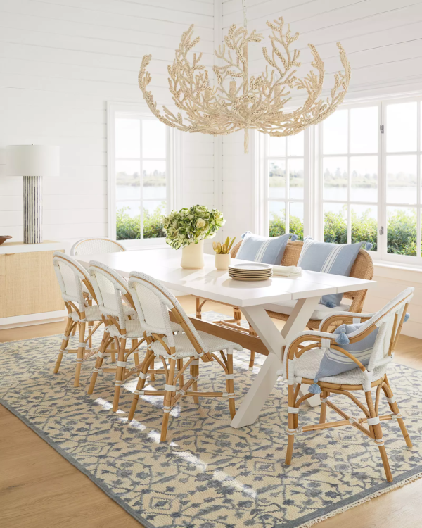 - Sustainable rattan and woven resin seats.
